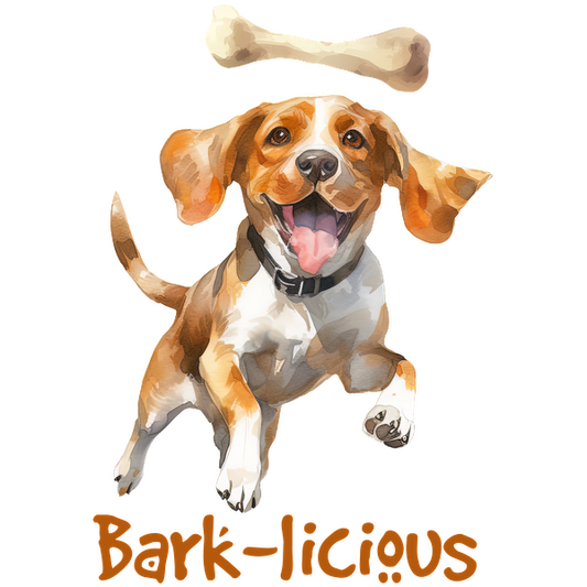 A cheerful Beagle leaps with excitement for a bone, showcasing a playful spirit and the text "Bark-licious" below. dtf transfers