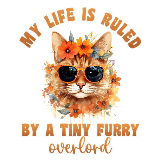 Regular price From £0.75 GBPRegular priceUnit price / per£2.39 GBPSale price From £0.75 GBPA whimsical illustration of a cat wearing sunglasses, adorned with colorful flowers, featuring the phrase about being ruled by a furry overlord. dtf transfers