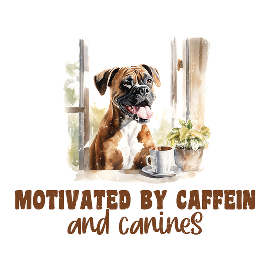 A charming illustration featuring a happy dog by an open window with a cup of coffee, captioned "Motivated by Caffeine and Canines." heat press transfers