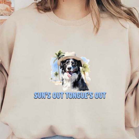 A cheerful dog wearing a straw hat with a beach backdrop, captioned “Sun’s Out Tongue’s Out,” perfect for summer vibes!dtf regular iron