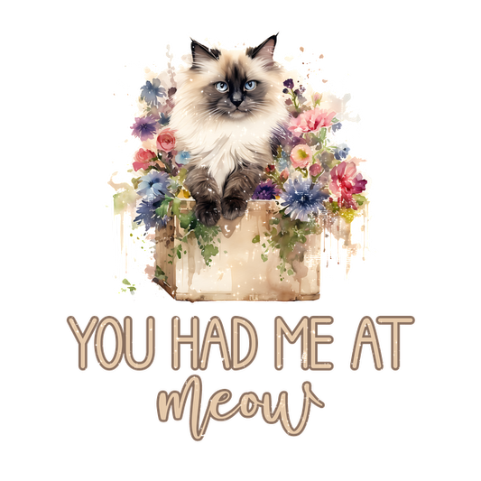 A charming illustration of a fluffy cat surrounded by colorful flowers, featuring the playful phrase, "You had me at meow." dtf transfers