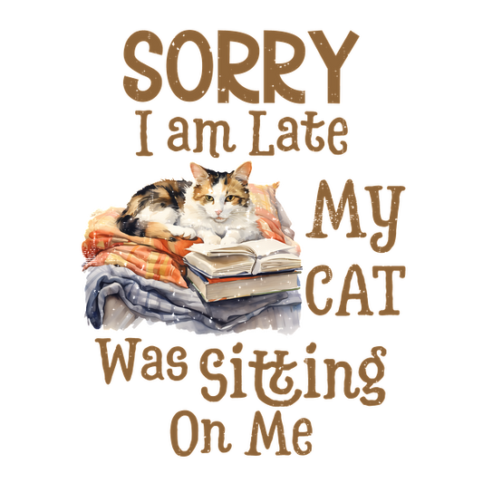 A playful design featuring a cozy cat on a stack of books with the humorous text about being late due to the pet.dtf regular iron