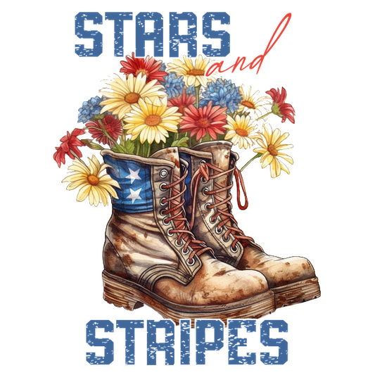 Regular price From £0.75 GBPRegular priceUnit price / per£2.39 GBPSale price From £0.75 GBPA rustic pair of military boots filled with vibrant flowers, featuring a backdrop of "Stars and Stripes" lettering. dtf prints