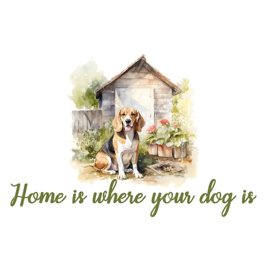 Regular price From £0.75 GBPRegular priceUnit price / per£2.39 GBPSale price From £0.75 GBPA charming watercolor illustration featuring a beagle sitting outside a cozy doghouse, accompanied by the phrase "Home is where your dog is." dtf transfers