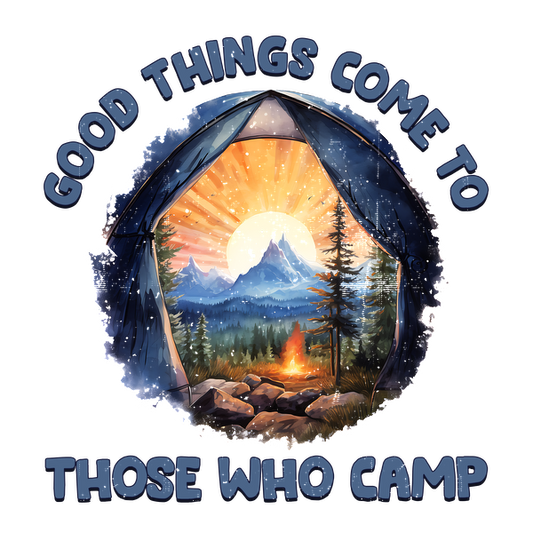 A vibrant camping-themed design featuring a scenic view of mountains and a sunrise, with the phrase "Good Things Come to Those Who Camp."dtf regular iron