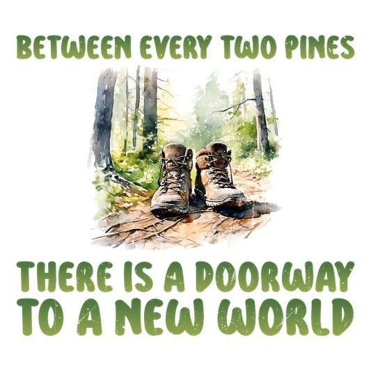 A pair of hiking boots rests on a forest floor, accompanied by an inspiring quote about exploration and new beginnings.dtf regular iron