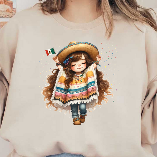 A cheerful girl in a vibrant poncho and wide-brimmed hat joyfully holds a Mexican flag, celebrating her culture.dtf regular iron