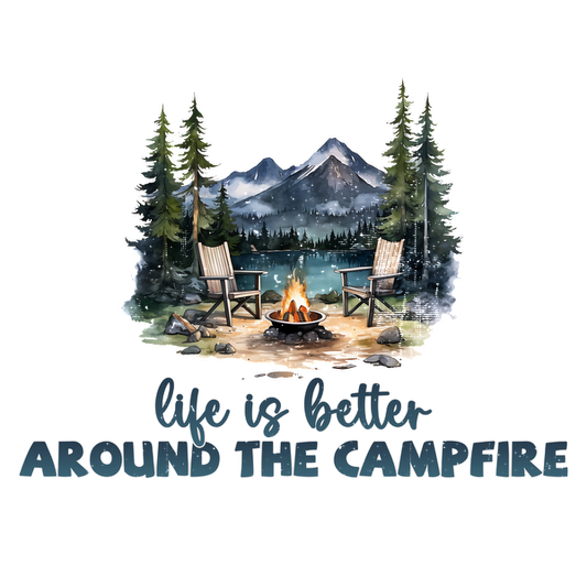 A serene campfire scene features chairs by the flames, surrounded by lush trees and majestic mountains, with the quote "life is better around the campfire." dtf transfers
