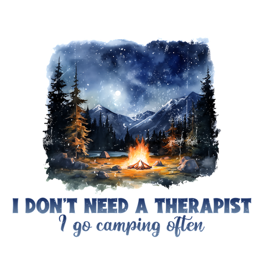 Regular price From £0.75 GBPRegular priceUnit price / per£2.39 GBPSale price From £0.75 GBPA serene camping scene featuring a glowing campfire surrounded by tall trees and mountains, with a humorous quote about therapy. heat press transfers
