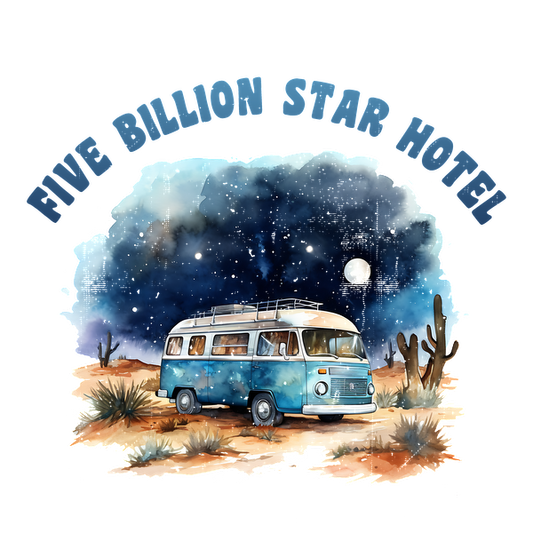 A whimsical illustration of a vintage blue camper van under a starry night sky, featuring the phrase "Five Billion Star Hotel." heat press transfersdtf regular iron