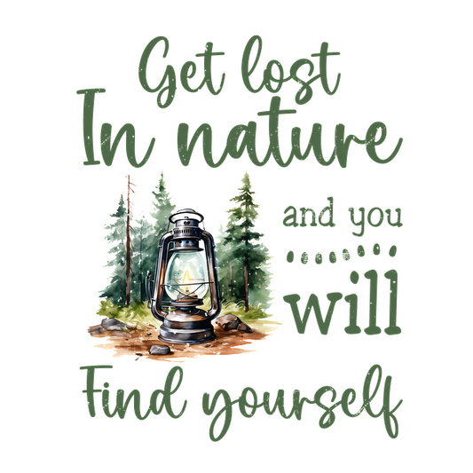 A rustic lantern surrounded by trees, paired with the inspiring phrase, "Get lost in nature and you will find yourself." dtf transfers