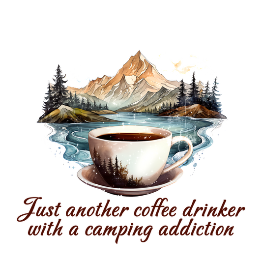 A cozy coffee cup illustration set against a serene mountain and lake backdrop, perfect for camping enthusiasts. dtf prints
