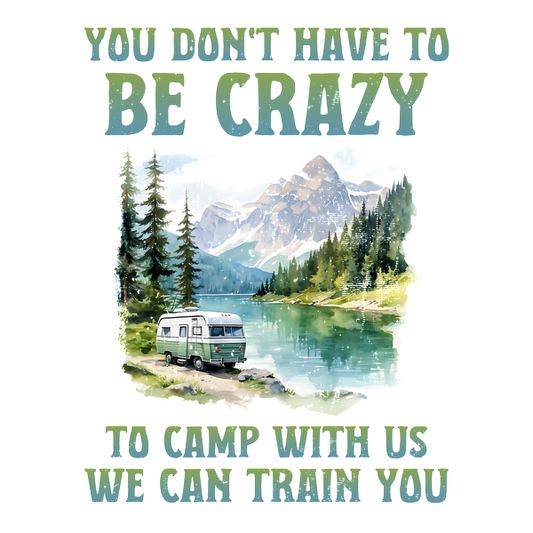 A whimsical camping-themed illustration featuring a vintage camper by a serene lake, inviting fun outdoor adventures with friends. heat press transfers