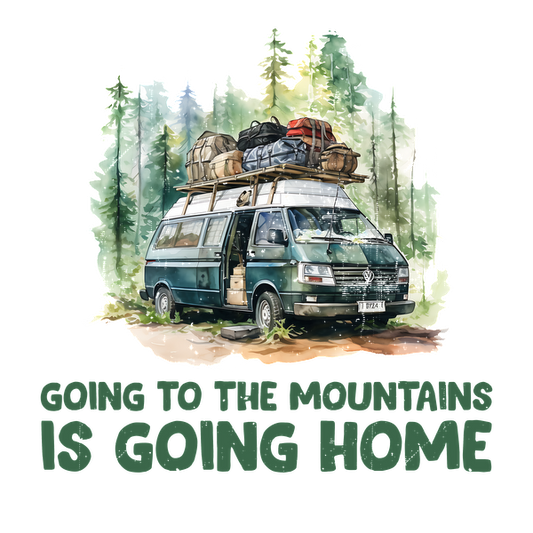 A vintage Volkswagen van, loaded with outdoor gear, set against a lush, mountainous backdrop, conveys the spirit of adventure. dtf prints