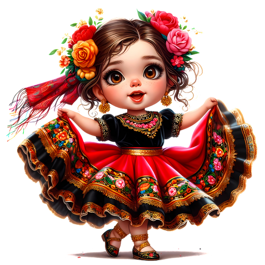 A cute girl in a colorful traditional dress, adorned with floral patterns and a matching flower hair accessory, joyfully dances. dtf transfers
