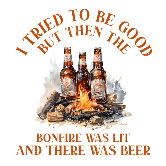 A fun design featuring three beer bottles and a bonfire, highlighting a humorous quote about enjoying life’s moments. dtf transfers