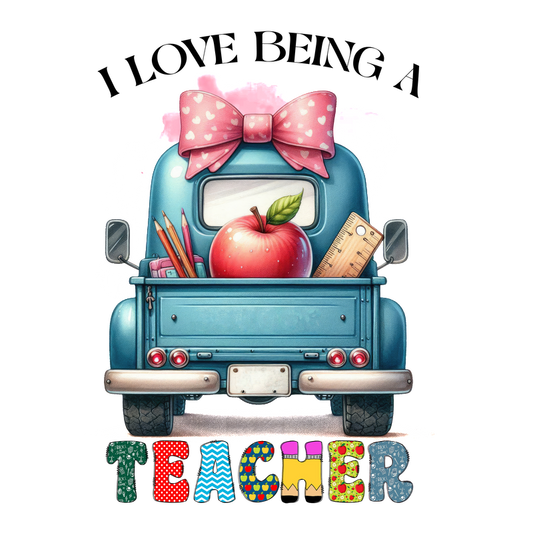 Regular price From £0.75 GBPRegular priceUnit price / per£2.40 GBPSale price From £0.75 GBPA charming blue truck adorned with a large pink bow, featuring school supplies and an apple in the back, highlighted by colorful "TEACHER" lettering.DTF Transfers