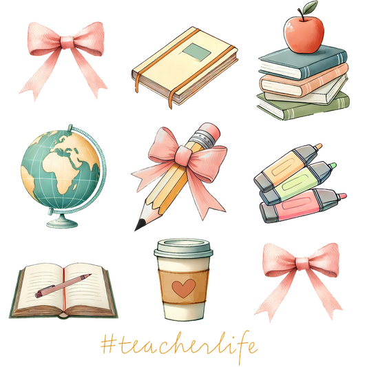 Regular price From £0.75 GBPRegular priceUnit price / per£2.40 GBPSale price From £0.75 GBPA charming collection of teaching essentials, featuring books, a globe, highlighters, a pencil with a bow, and a coffee cup, all celebrating #teacherlife.DTF Transfers