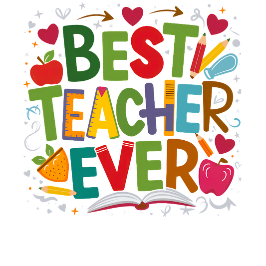A colorful and whimsical design celebrating educators with the phrase "Best Teacher Ever," featuring fun illustrations like apples and books.DTF Transfers