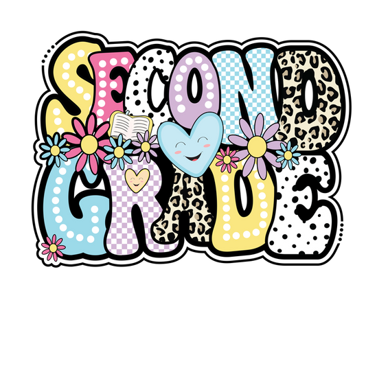 Colorful and playful "Second Grade" design featuring vibrant letters, flowers, and a cute heart, perfect for classroom decor!DTF Transfers