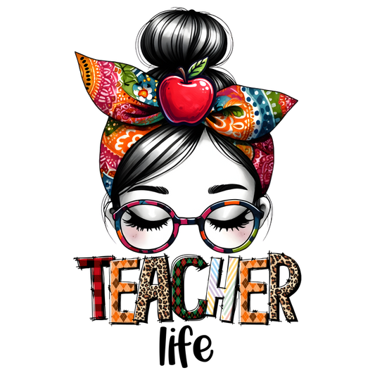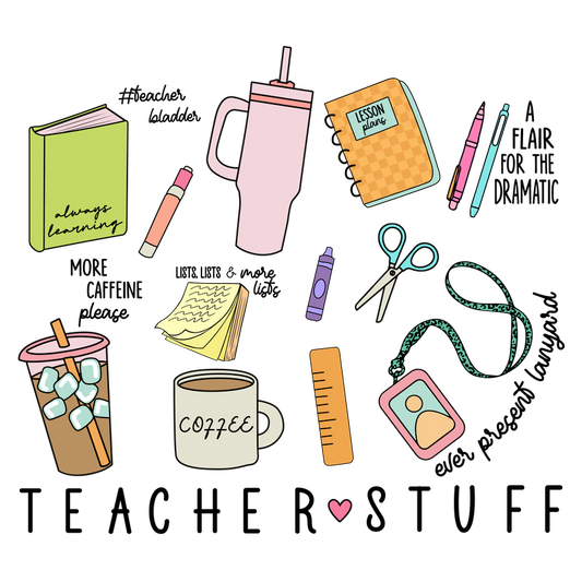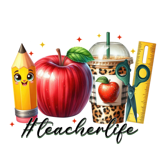 Celebrate #TeacherLife with this vibrant design featuring a cheerful pencil, a shiny red apple, trendy drink, scissors, and ruler!DTF Transfers