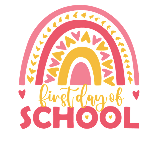 Cheerful design celebrating the "First Day of School," featuring vibrant colors, a playful rainbow, and heart accents. Perfect for back-to-school moments!DTF Transfers