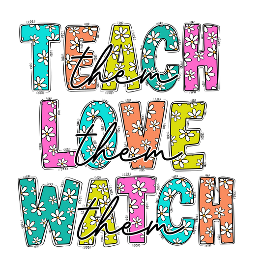 A colorful and cheerful design featuring the words "Teach them, Love them, Watch them" with floral patterns.DTF Transfers