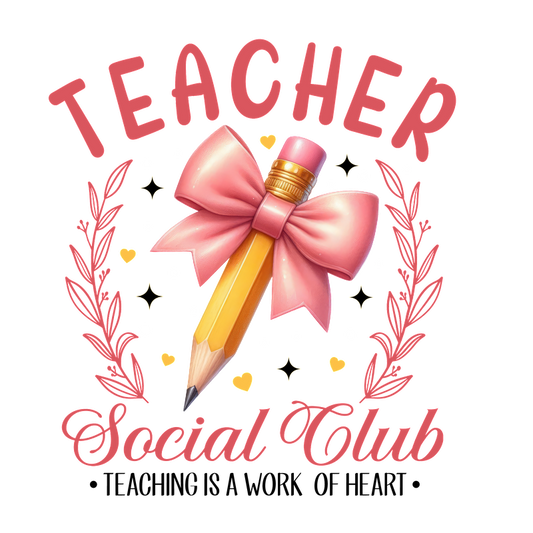 A playful design featuring a pink bow and pencil, celebrating the "Teacher Social Club" with decorative flourishes.DTF Transfers