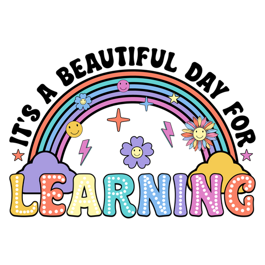 A colorful, playful design featuring the word "LEARNING" under a vibrant rainbow, adorned with cheerful flowers and smiling clouds.DTF Transfers