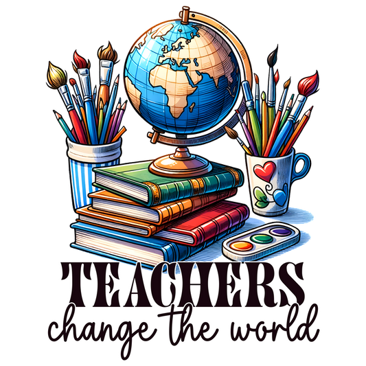 Celebrate the impact of teachers with this vibrant design featuring a globe, books, and art supplies, showcasing creativity and education!DTF Transfers