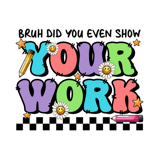 Bright and playful graphic featuring the words "YOUR WORK" in colorful letters, adorned with smiles, flowers, and pencils.DTF Transfers