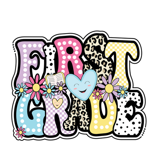 A vibrant and fun design featuring the words "FIRST GRADE" with colorful letters and playful floral accents.DTF Transfers