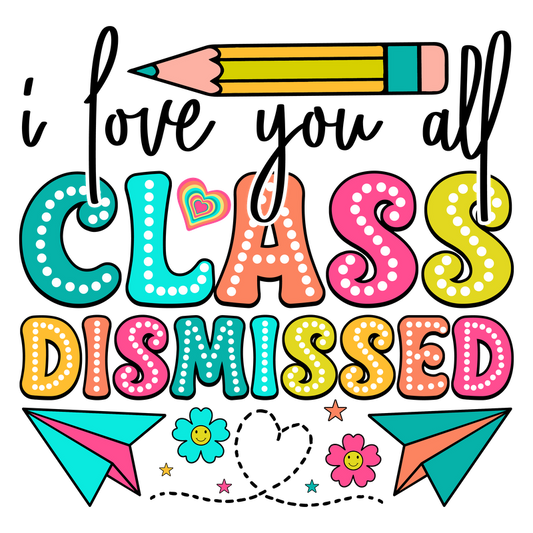 Fun and colorful "Class Dismissed" design with playful elements like a pencil, paper airplanes, and cheerful flowers!DTF Transfers