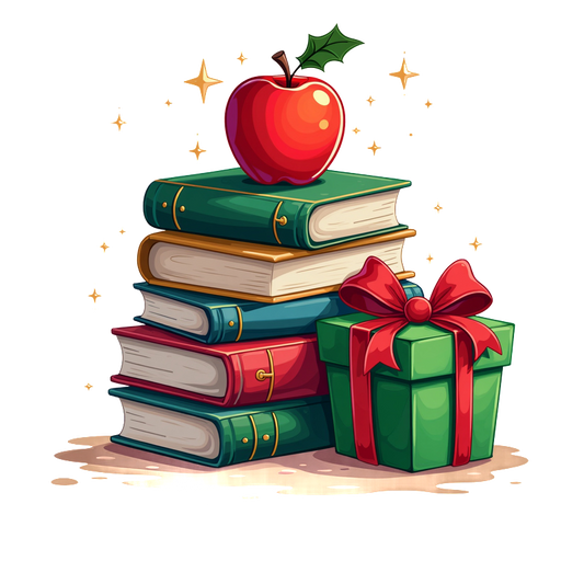 A whimsical stack of colorful books topped with a shiny red apple and a festive green gift with a red ribbon.DTF Transfers