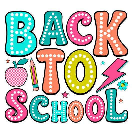Bright and playful "Back to School" lettering featuring colorful letters, an apple, a pencil, and fun illustrations.DTF Transfers