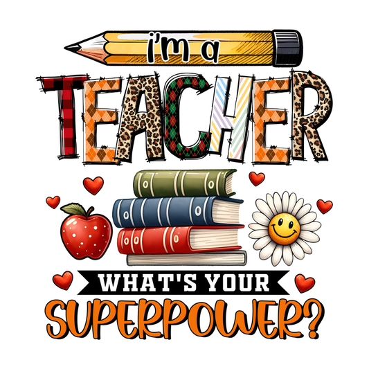 A colorful and playful graphic featuring the text "I'm a Teacher, What's Your Superpower?" accompanied by a pencil, books, an apple, and a cheerful flower.DTF Transfers