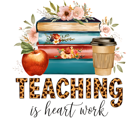 "Celebrate teaching with this charming design featuring colorful books, an apple, flowers, and a coffee cup, emphasizing 'Teaching is heart work'!"DTF Transfers