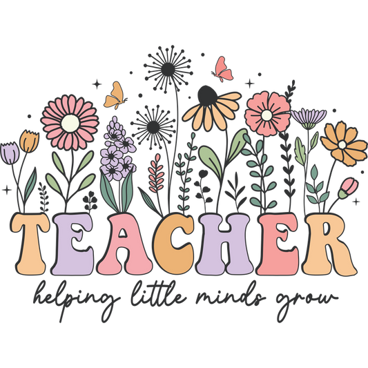 A colorful floral design featuring the word "TEACHER" with the phrase "helping little minds grow," celebrating the teaching profession.DTF Transfers
