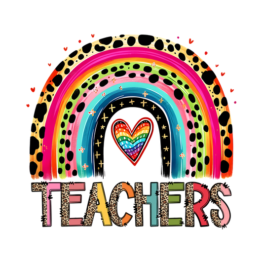 Vibrant rainbow design featuring a heart, with the word "TEACHERS" in bold, colorful letters, celebrating educators’ impact.DTF Transfers