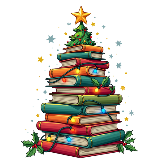 Regular price From £0.75 GBPRegular priceUnit price / per£2.40 GBPSale price From £0.75 GBPA festive stack of colorful books arranged like a Christmas tree, adorned with twinkling lights and a star top.DTF Transfers