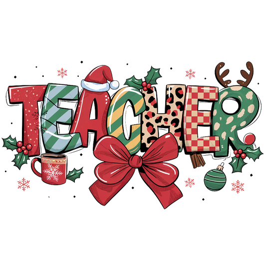 Celebrate the season with this festive "TEACHER" design, featuring vibrant holiday colors, patterns, and cheerful decorations like a Santa hat and bow.DTF Transfers