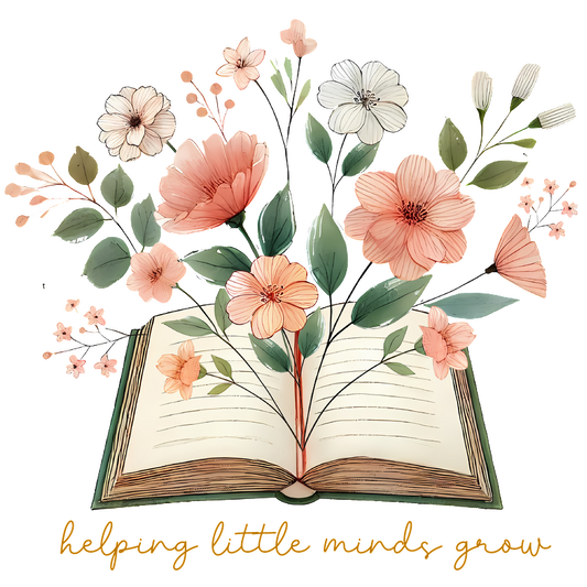 An enchanting illustration of an open book surrounded by vibrant flowers, symbolizing growth and knowledge for young minds.DTF Transfers
