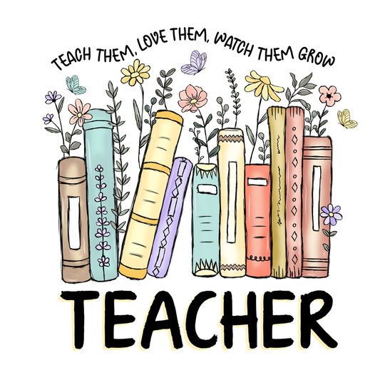 Regular price From £0.75 GBPRegular priceUnit price / per£2.40 GBPSale price From £0.75 GBPA charming illustration of colorful books adorned with flowers and butterflies, highlighting the word "TEACHER" in a whimsical style.DTF Transfers