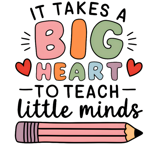 A colorful and playful design reminding us that teaching little minds requires a big heart, featuring a pink pencil illustration.DTF Transfers