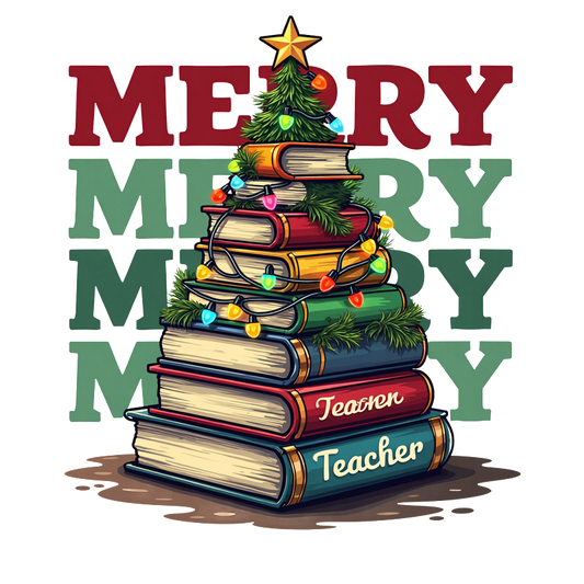 A festive design featuring stacked books decorated as a Christmas tree, adorned with lights, and fun "Merry" text.DTF Transfers