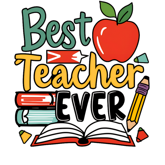 A vibrant and playful graphic celebrating educators, featuring the text "Best Teacher Ever" with colorful books, a pencil, and an apple.DTF Transfers