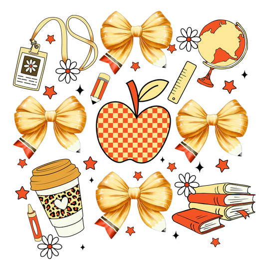 Regular price From £0.75 GBPRegular priceUnit price / per£2.40 GBPSale price From £0.75 GBPA vibrant back-to-school themed illustration featuring yellow bows, an apple, books, a globe, and school supplies, perfect for any student.DTF Transfers