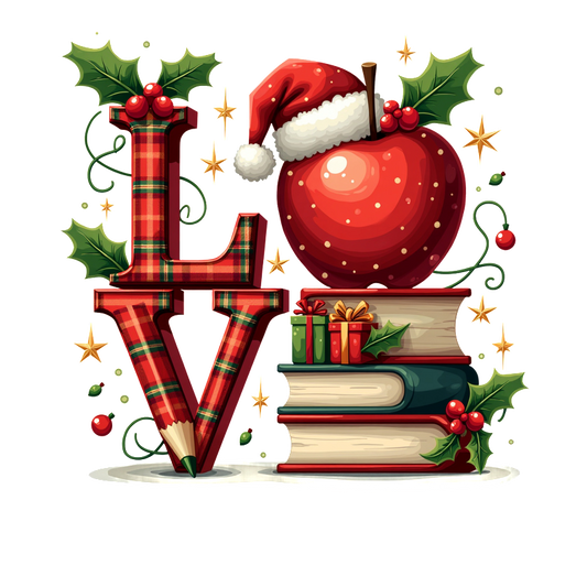 Festive illustration featuring plaid letters spelling "LOVE," stacked books, an apple wearing a Santa hat, and holiday decorations.DTF Transfers