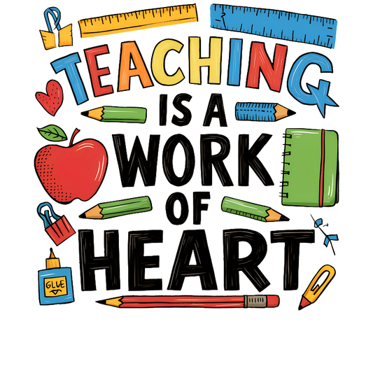 A vibrant illustration emphasizing "Teaching is a Work of Heart," surrounded by school supplies like pencils, an apple, and glue.DTF Transfers