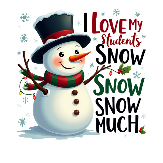 Regular price From £0.75 GBPRegular priceUnit price / per£2.40 GBPSale price From £0.75 GBPA cheerful snowman wearing a top hat and colorful scarf holds twigs while expressing love for students in a snowy scene.DTF Transfers